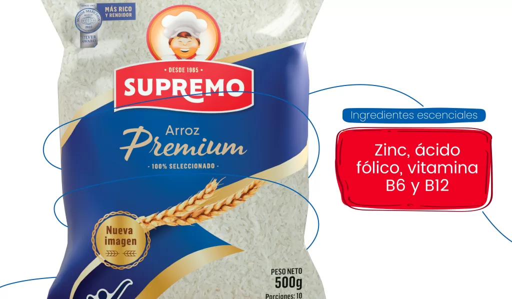 Supremo Premium enriquece tu mesa con ingredientes esenciales: Zinc, vitamina B6, B12 y ácido fólico, nutrientes clave para el sistema inmunológico, crecimiento y bienestar general. Además, somos la única marca de arroz en Colombia con 4 sellos de calidad Monde Selection